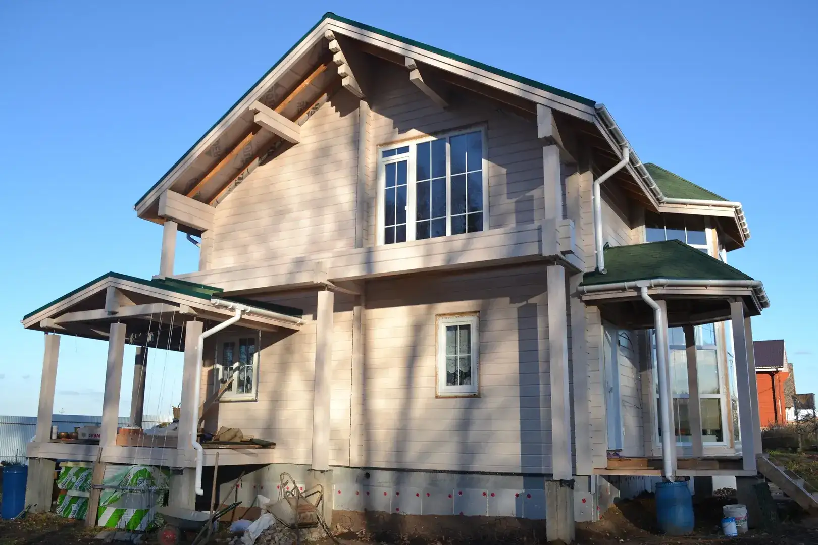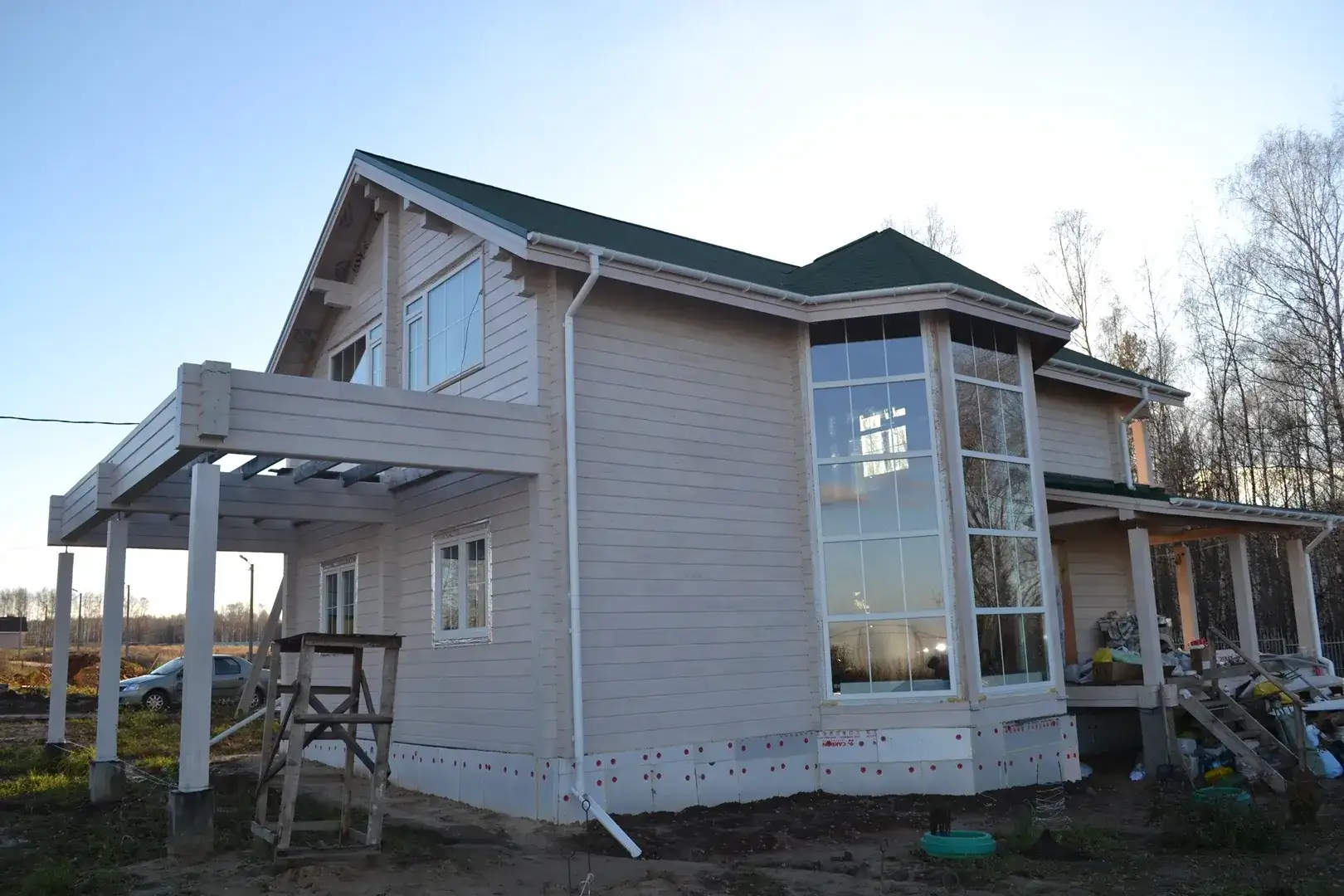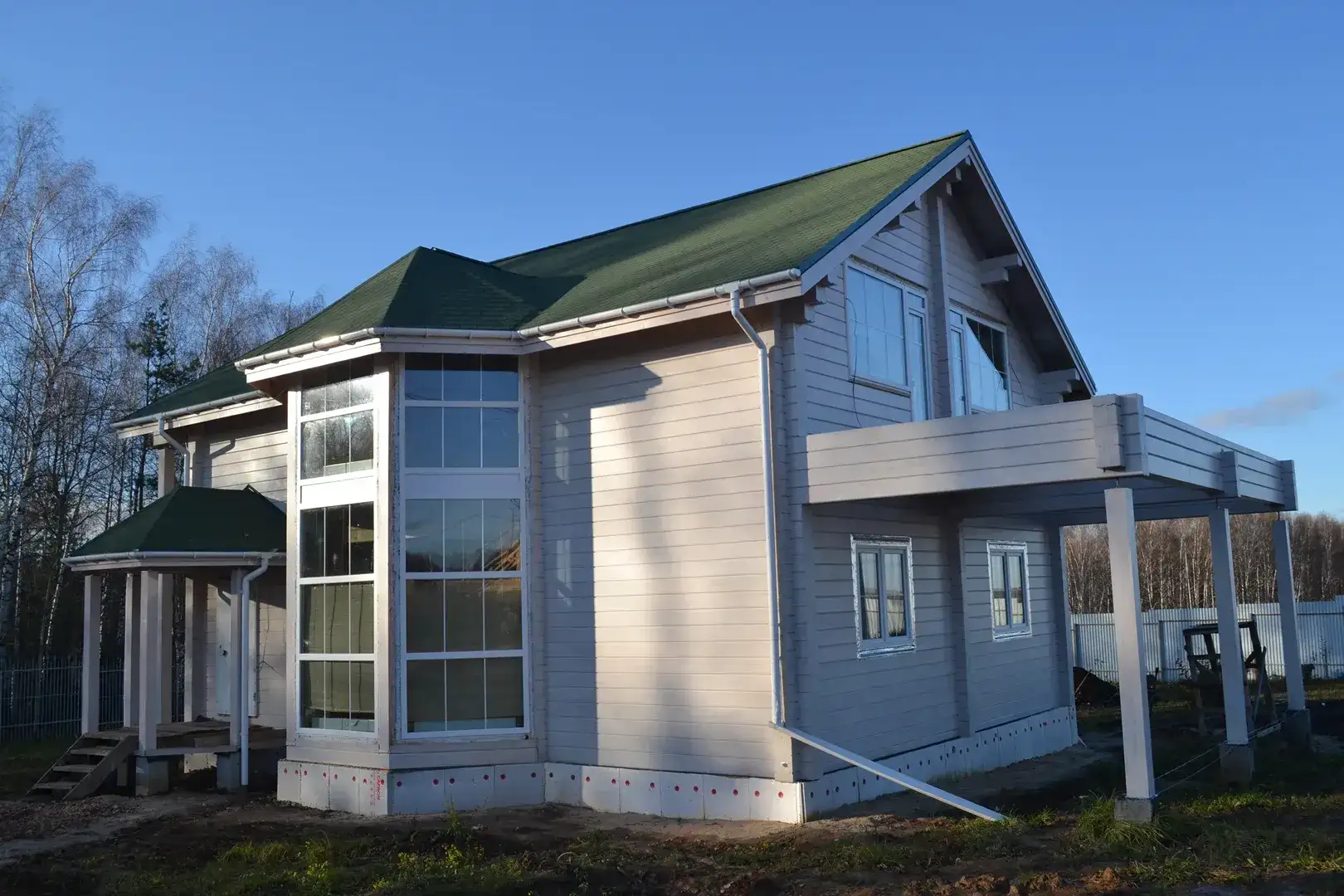 Двухэтажный коттедж из клееного бруса толщиной 200 мм. Главный акцент в архитектуре дома — стеклянный эркер, который дополняет гостиную и служит вторым светом в помещении. Дом дополнен навесом и небольшим крыльцом