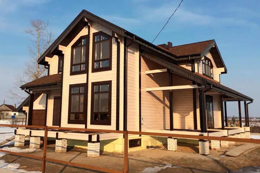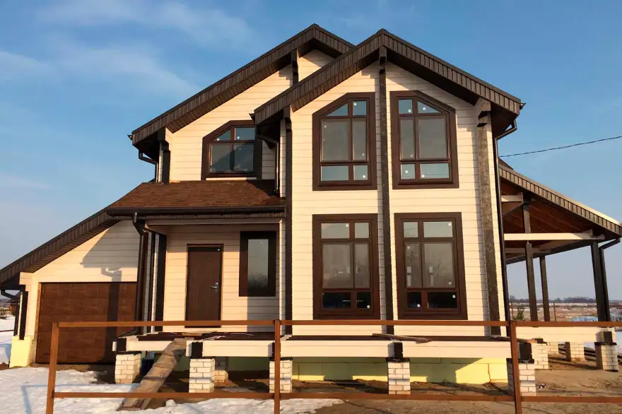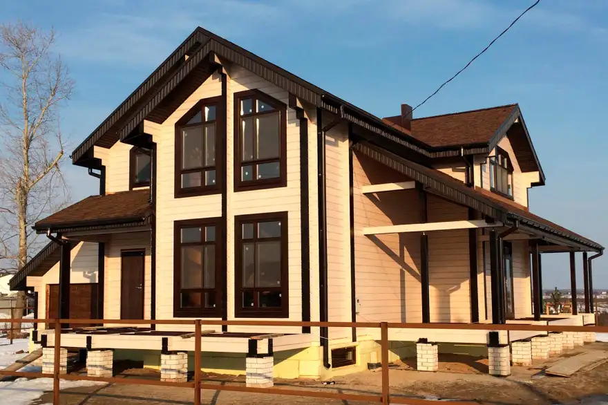 كوخ متوسط الحجم مع نافذة إضاءة ثانية. منزل جذاب للإقامة الدائمة مصنوع من الخشب الرقائقي بسماكة 210x190 ملم، صُمم حسب الطلب.