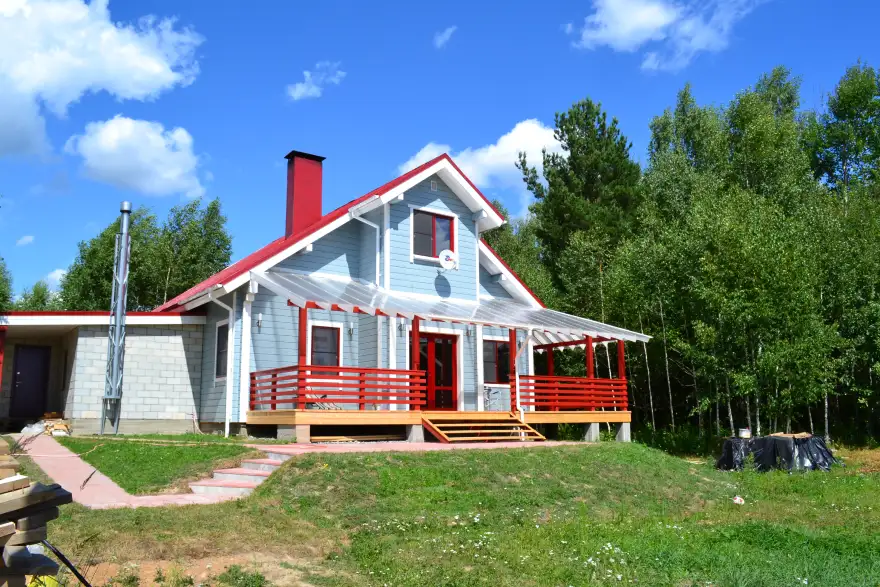 كوخ صغير ولكنه مشرق للغاية مصنوع من الخشب الرقائقي مع مرآب من الطوب ملحق به. البساطة والفعالية الاقتصادية للحلول الهيكلية يتم تحسينها بواسطة التصميم الأصلي. يوجد مخرج من المنزل إلى المرآب الذي يتسع لسيارتين.