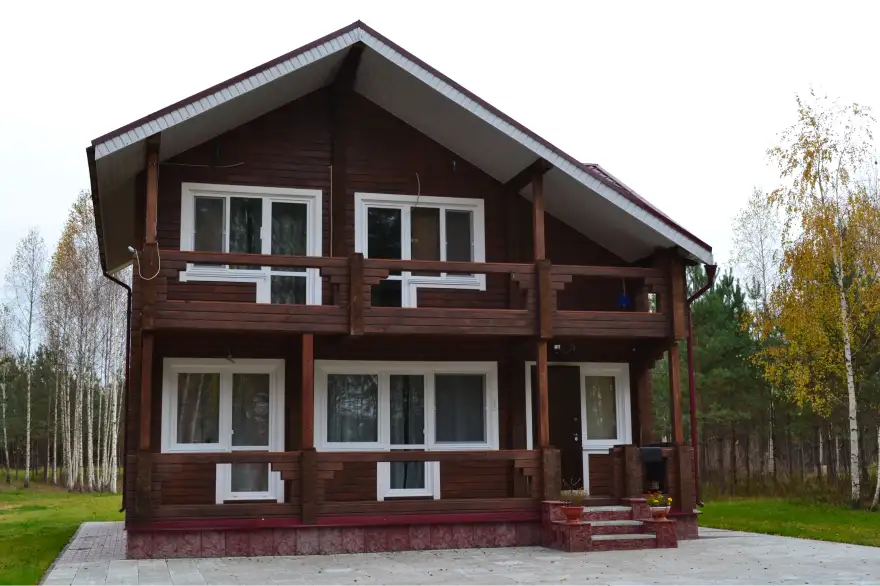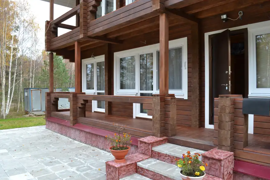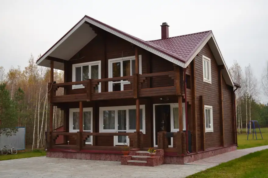 كوخ كلاسيكي متوسط الحجم مع سقف مائل بأربع جهات. تصميم أماكن الغرف يسمح باستضافة عدد كبير من الضيوف. بالإضافة إلى ذلك، يمكن استخدام المنزل المصنوع من الخشب الرقائقي بسماكة 210 ملم كمحل إقامة دائم حتى في فصل الشتاء.
