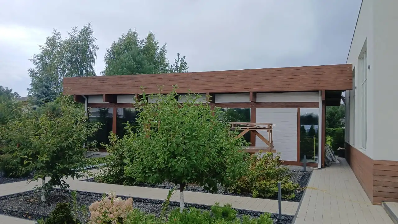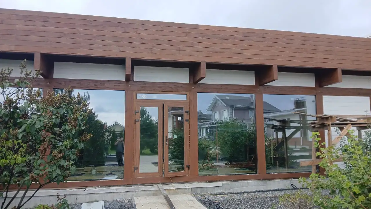 بناء صالة ألعاب رياضية في منطقة جوروديتسكي في منطقة نيجني نوفغورود. تم استخدام الهياكل نصف الخشبية ذات الزجاج البانورامي كجزء من المشروع.