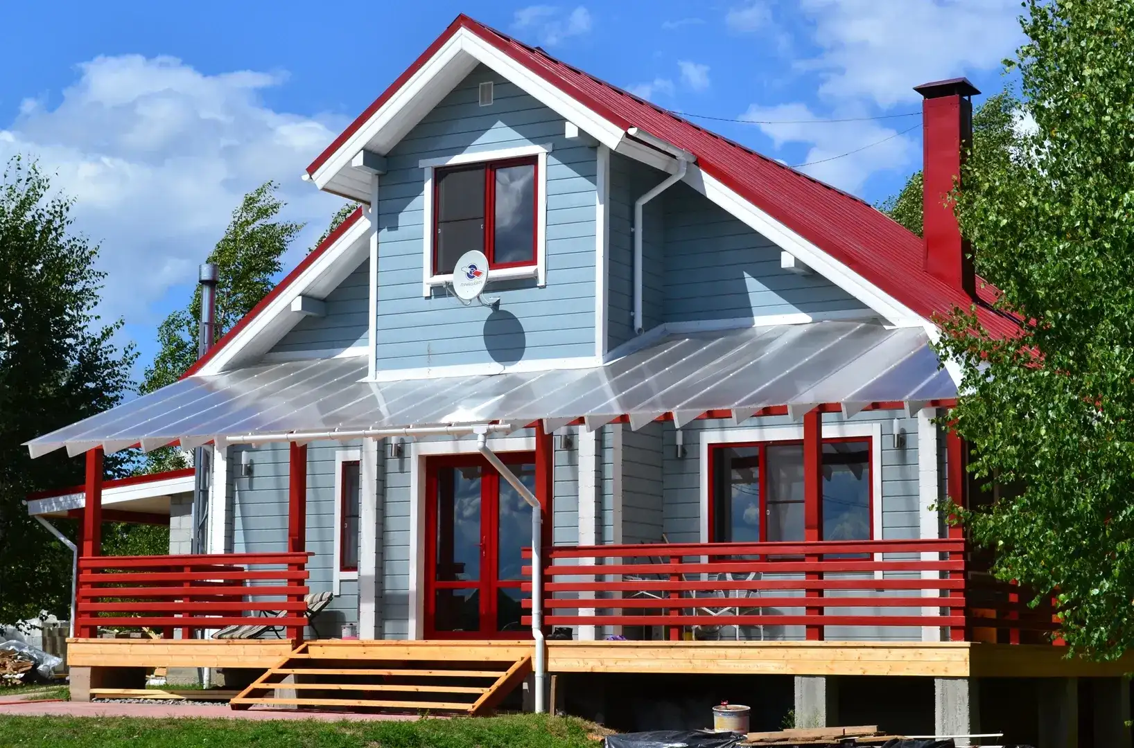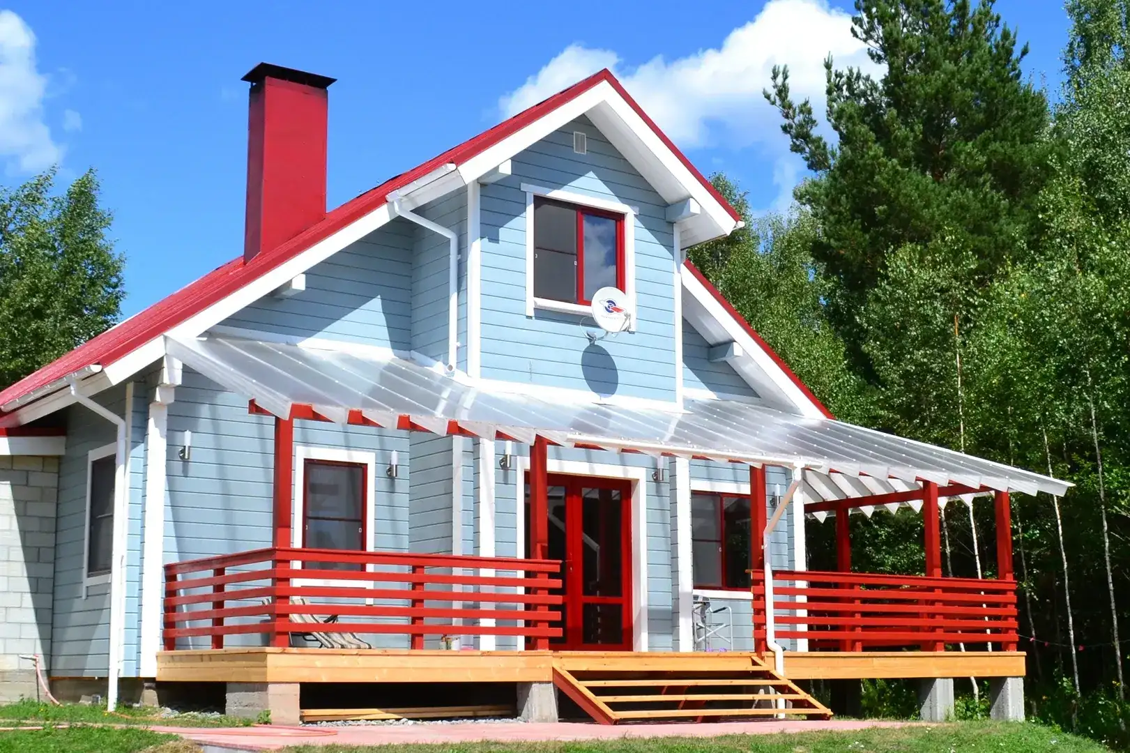 كوخ صغير ولكنه مشرق للغاية مصنوع من الخشب الرقائقي مع مرآب من الطوب ملحق به. البساطة والفعالية الاقتصادية للحلول الهيكلية يتم تحسينها بواسطة التصميم الأصلي. يوجد مخرج من المنزل إلى المرآب الذي يتسع لسيارتين.
