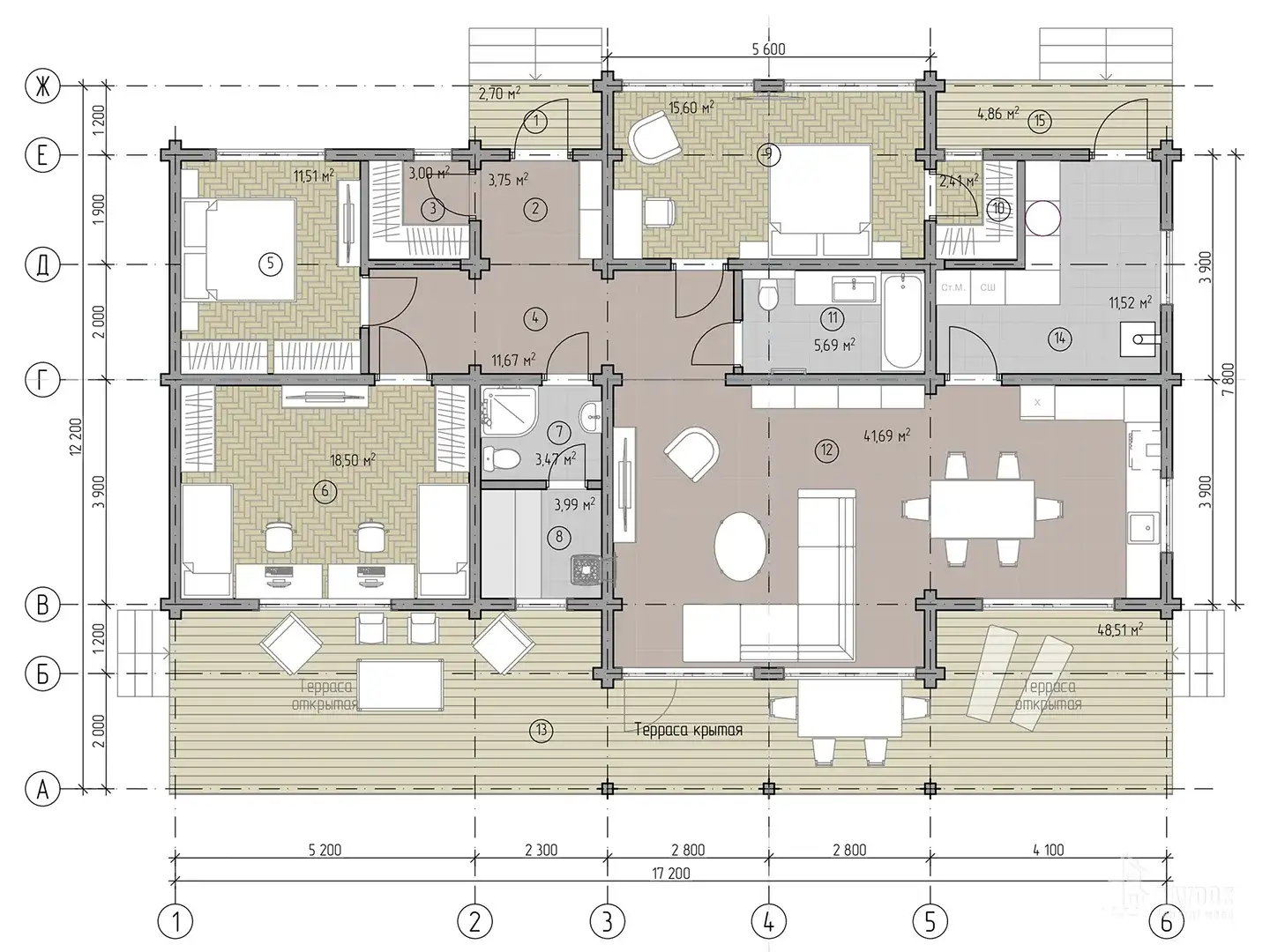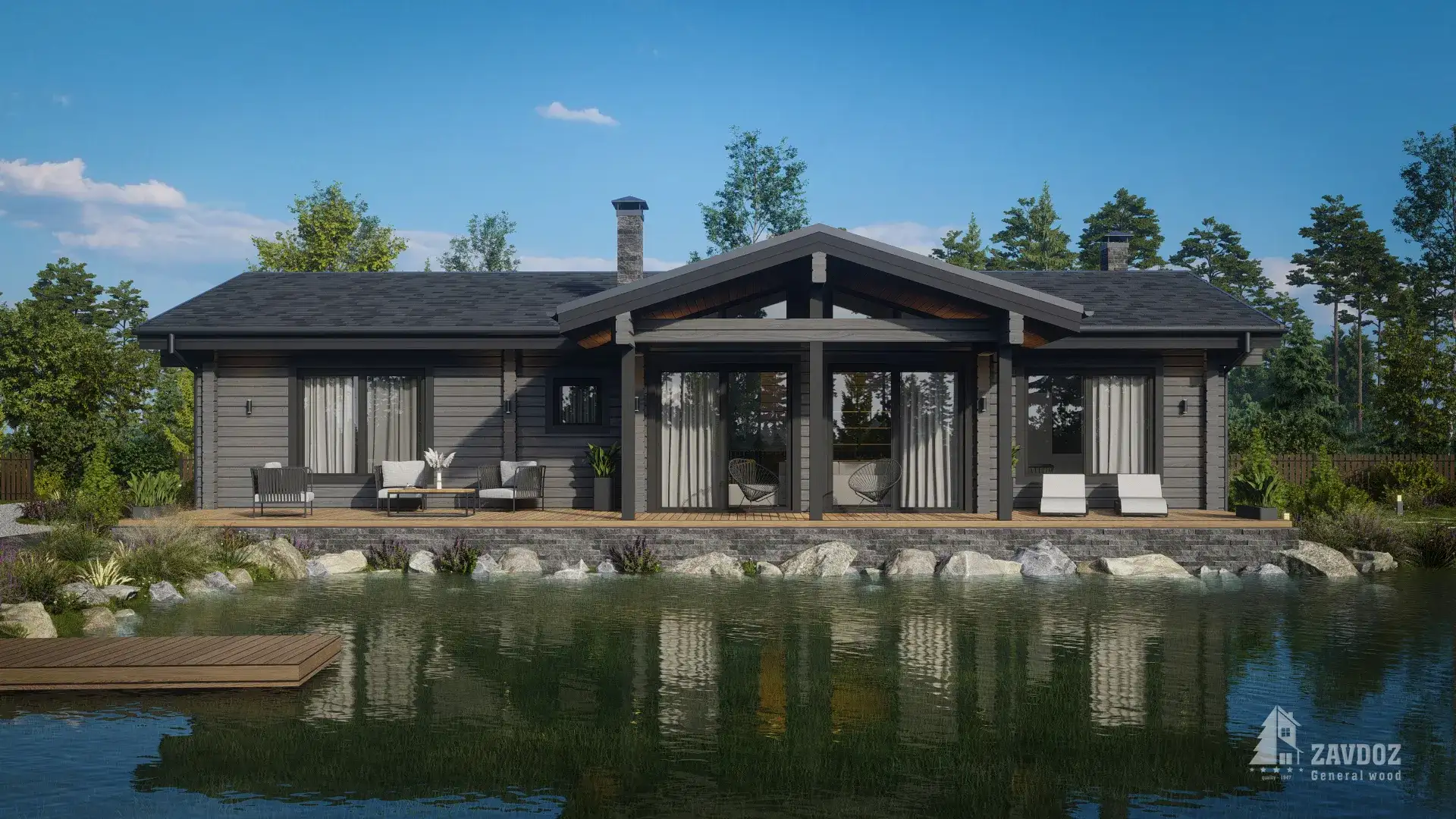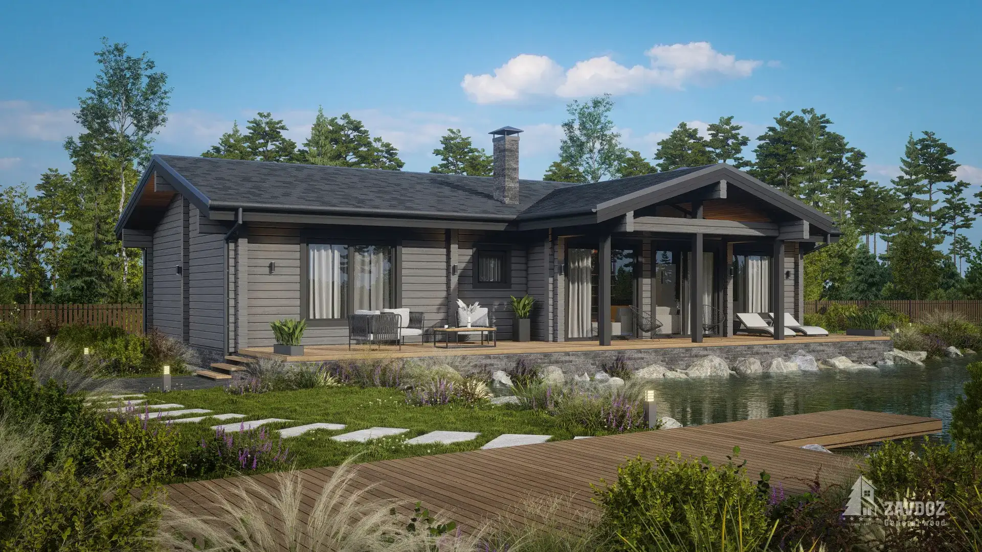 Одноэтажный дом в финском стиле с 3 спальнями и 2 санузлами. Дополнен парной и террасами: крытой и открытой
