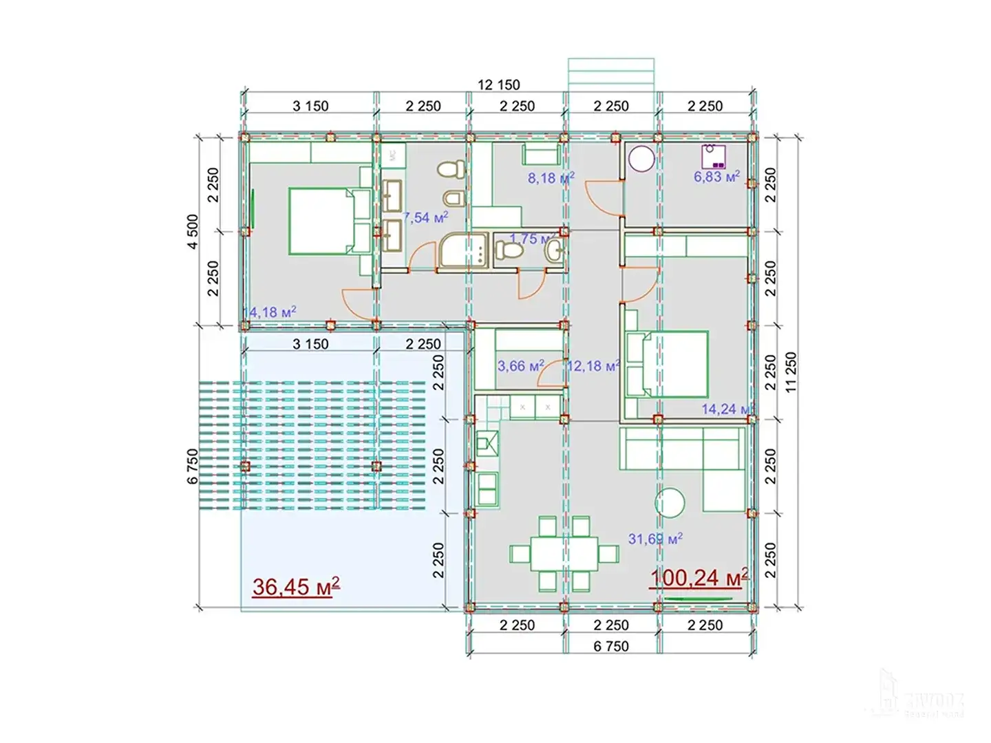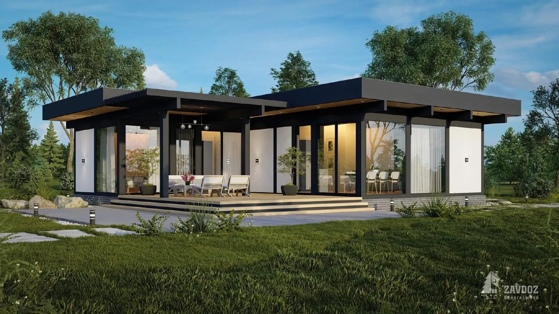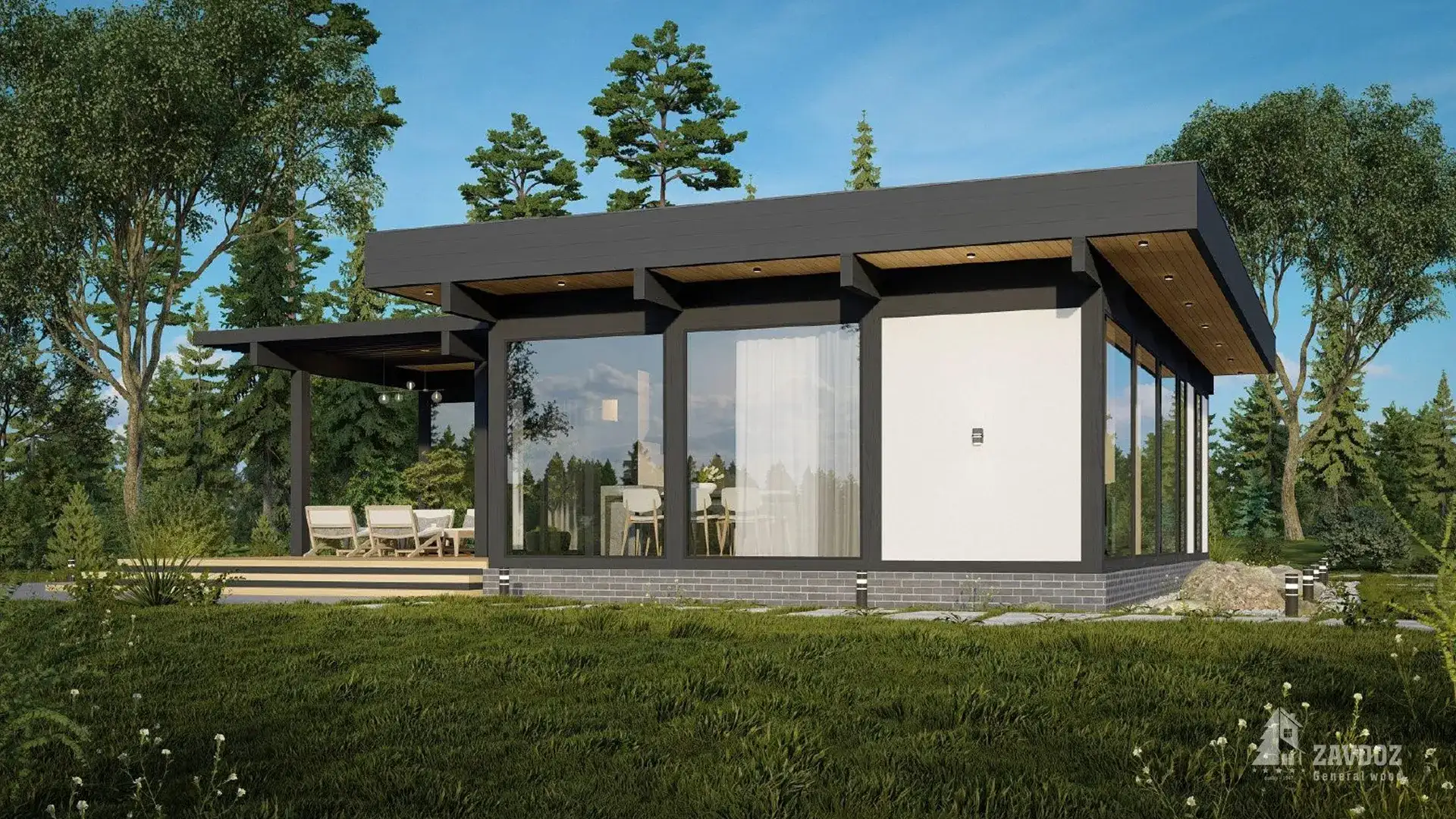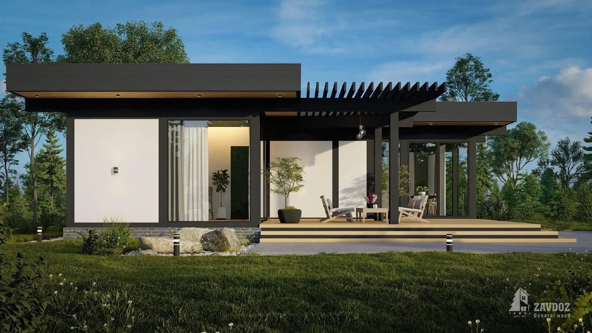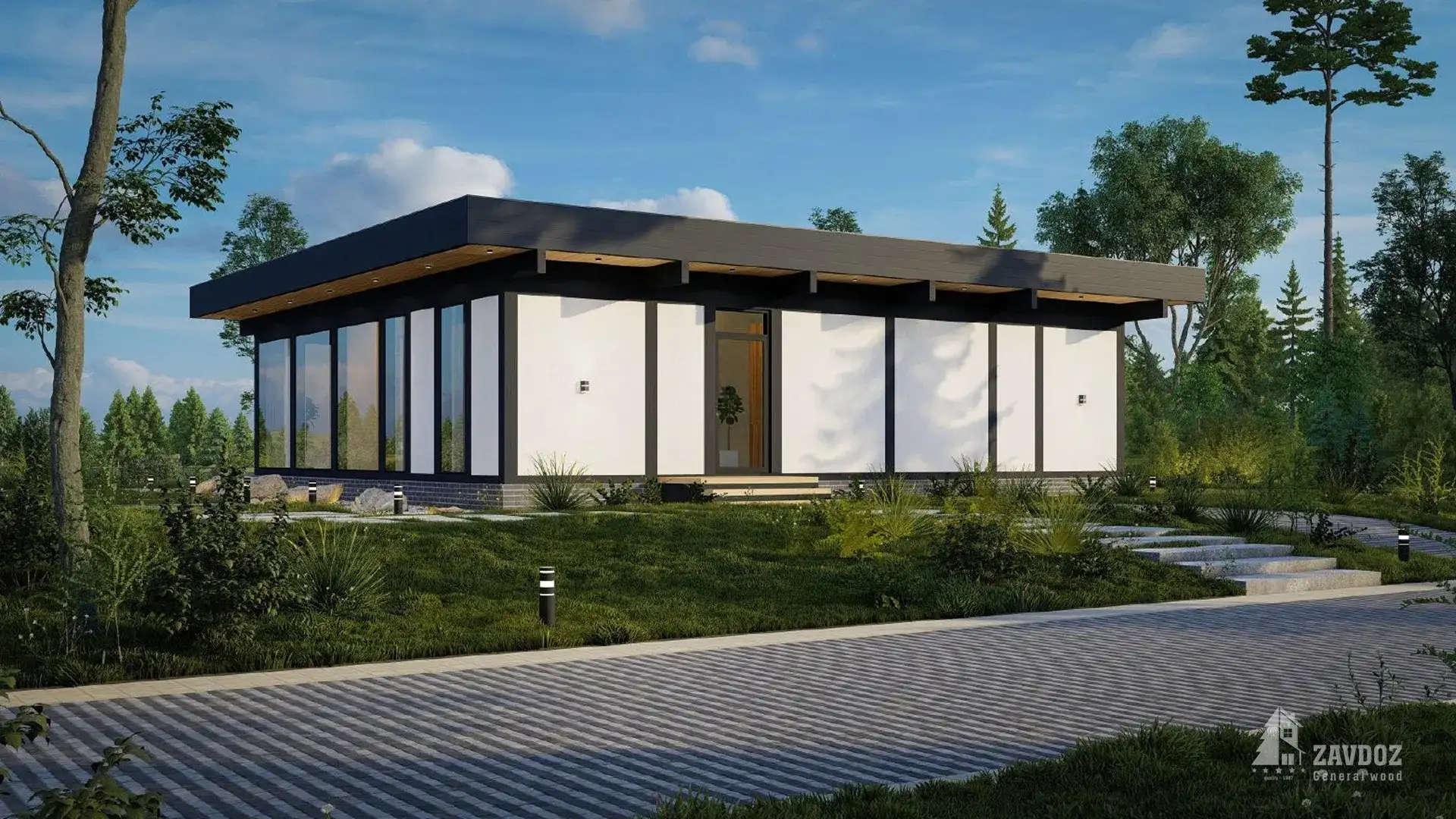Одноэтажный фахверк в стиле хай-тек с плоской кровлей. 2 спальни, 2 санузла, небольшая терраса