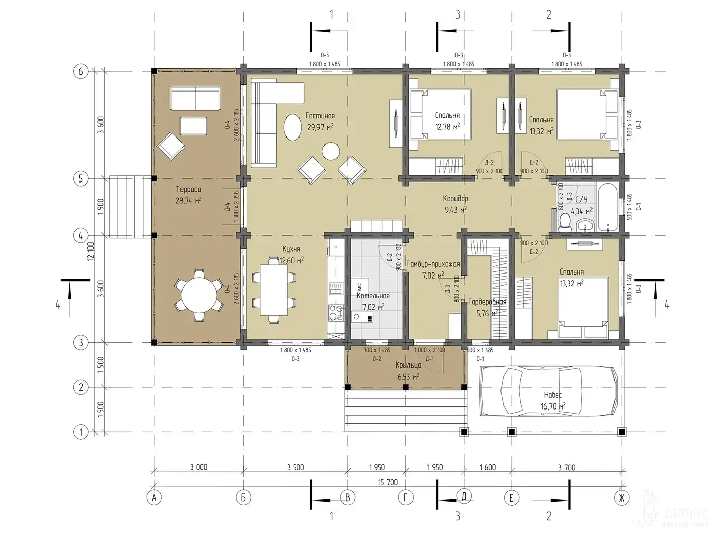 Одноэтажный дом из клееного бруса в стиле шале. 3 спальни, 1 санузел. Дополнен террасой и навесом для авто