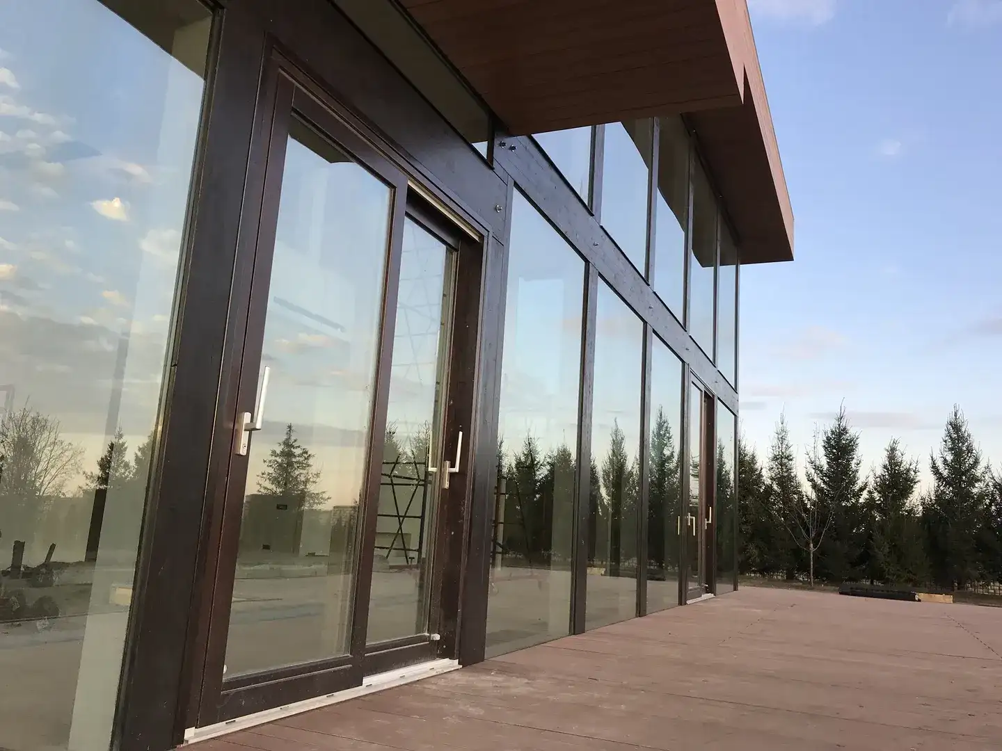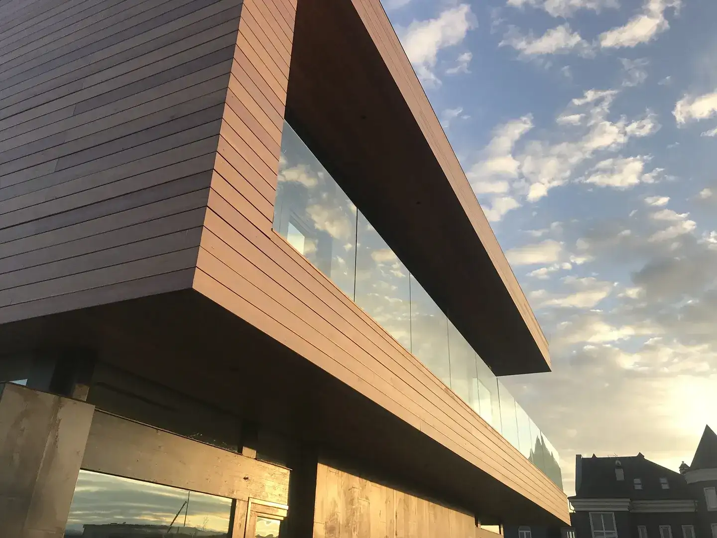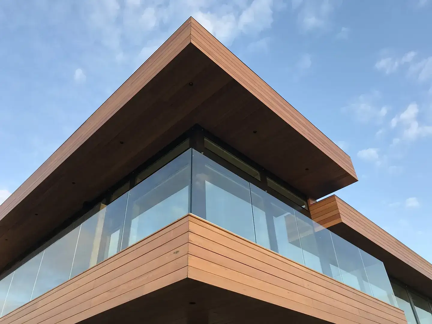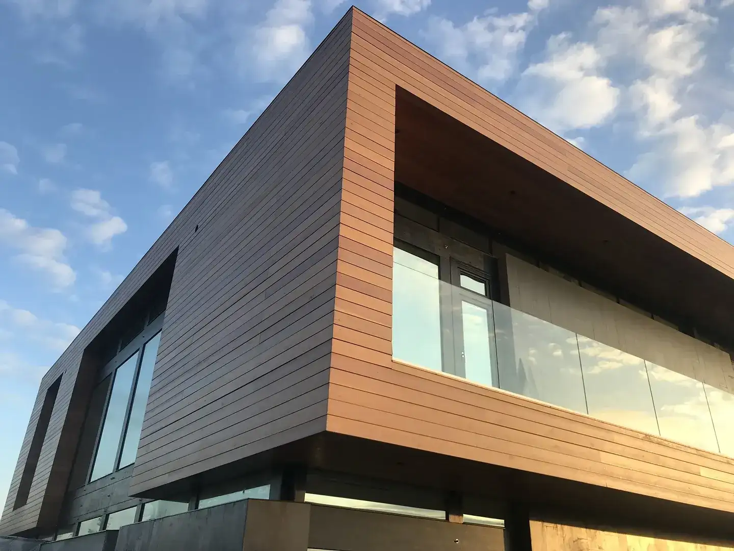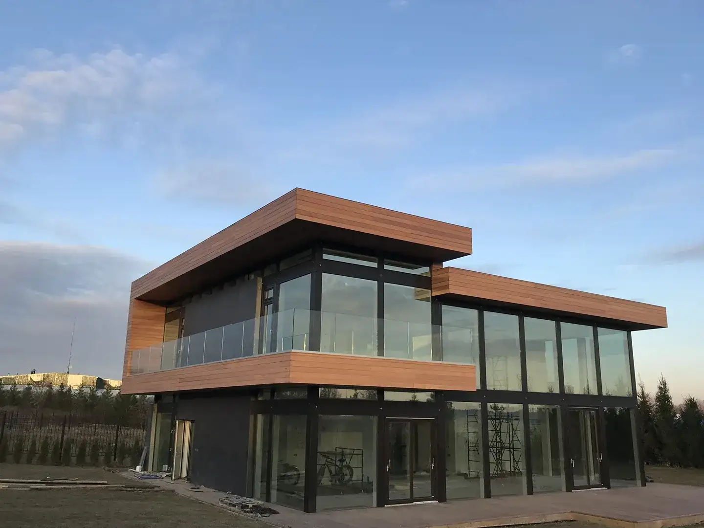 Индивидуальный проект жилого дома, построенный по технологии фахверк. Необычная геометрия, плоская разноуровневая крыша и панорамное остекление по всему фасаду здания