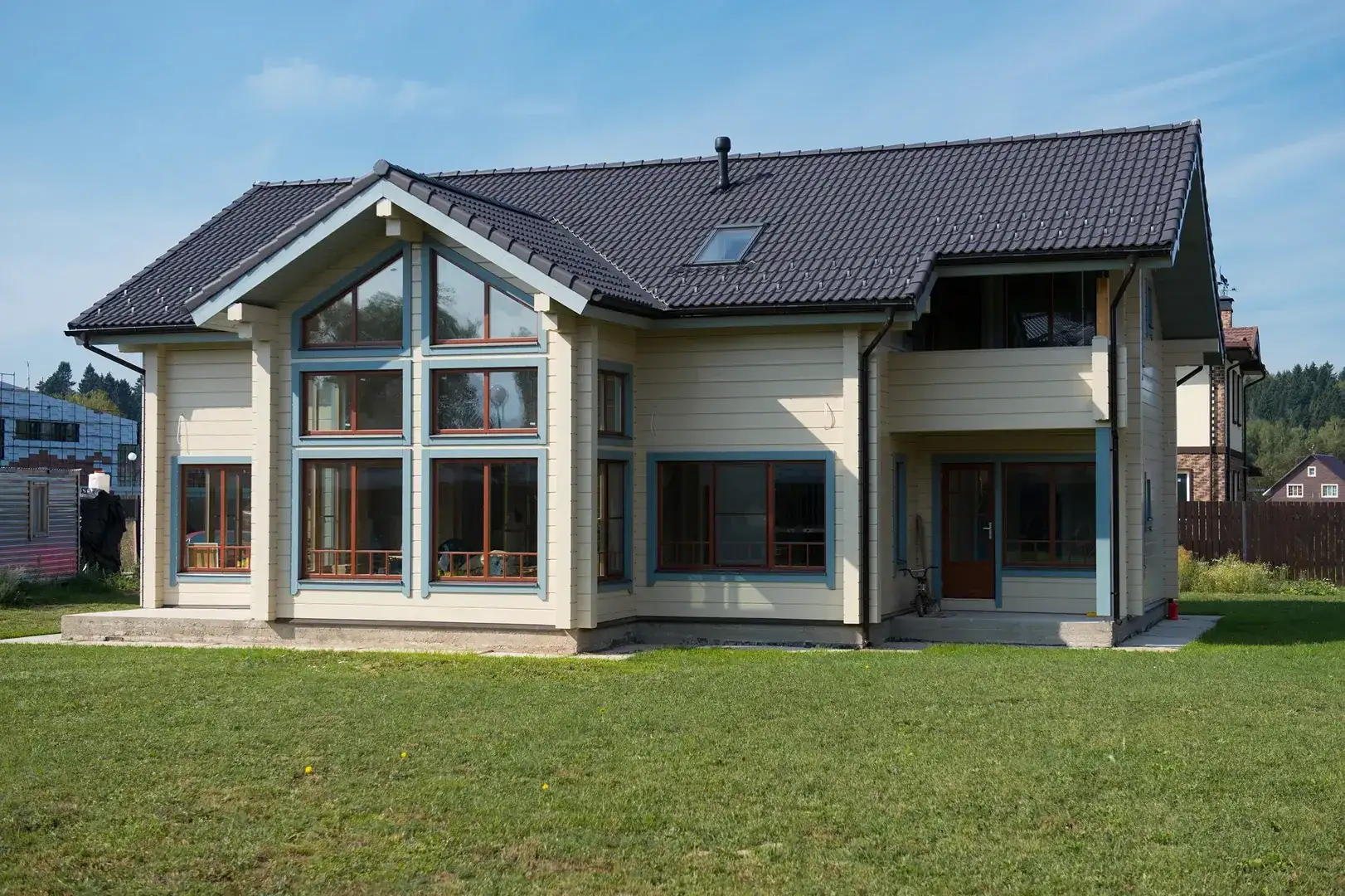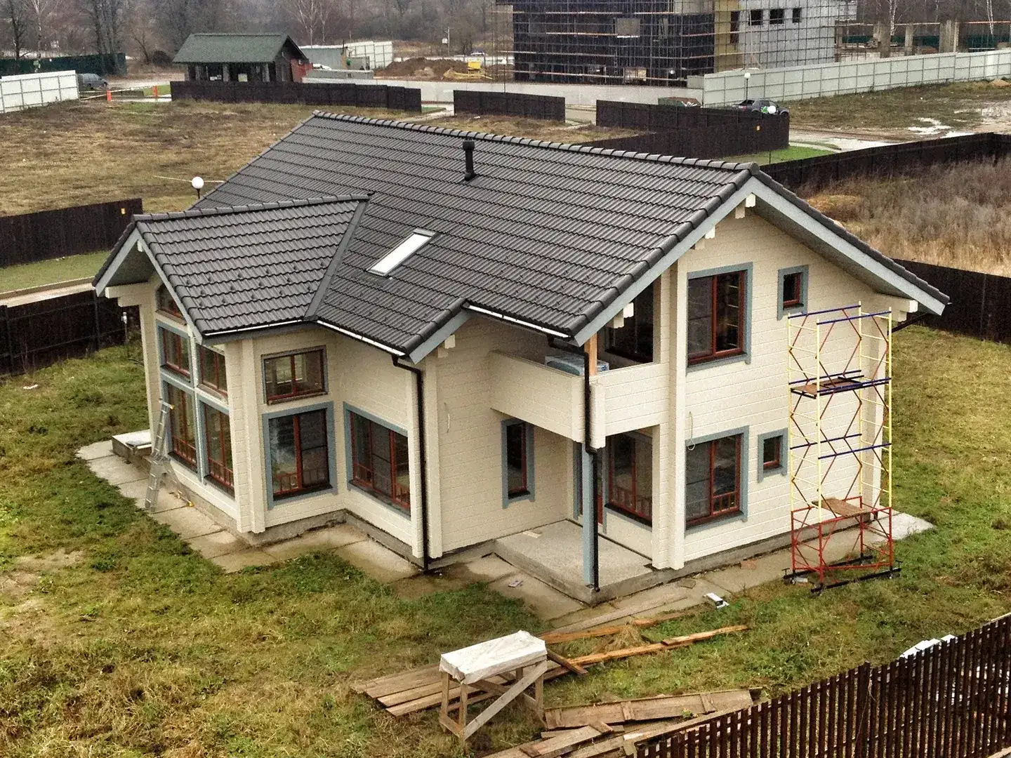 При проектировании дома за основу был взят проект «Шилторн», однако в планировку были внесены изменения. В частности второй свет был выведен в виде парадного эркера. Дом изготовлен из двойного клееного бруса сечением 210х235 мм