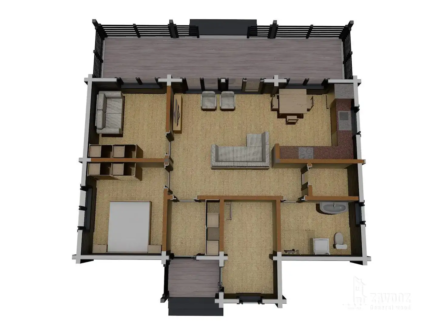 Дом из клееного бруса в стиле шале с 1 этажом. 1 спальня, 1 санузел, небольшая терраса