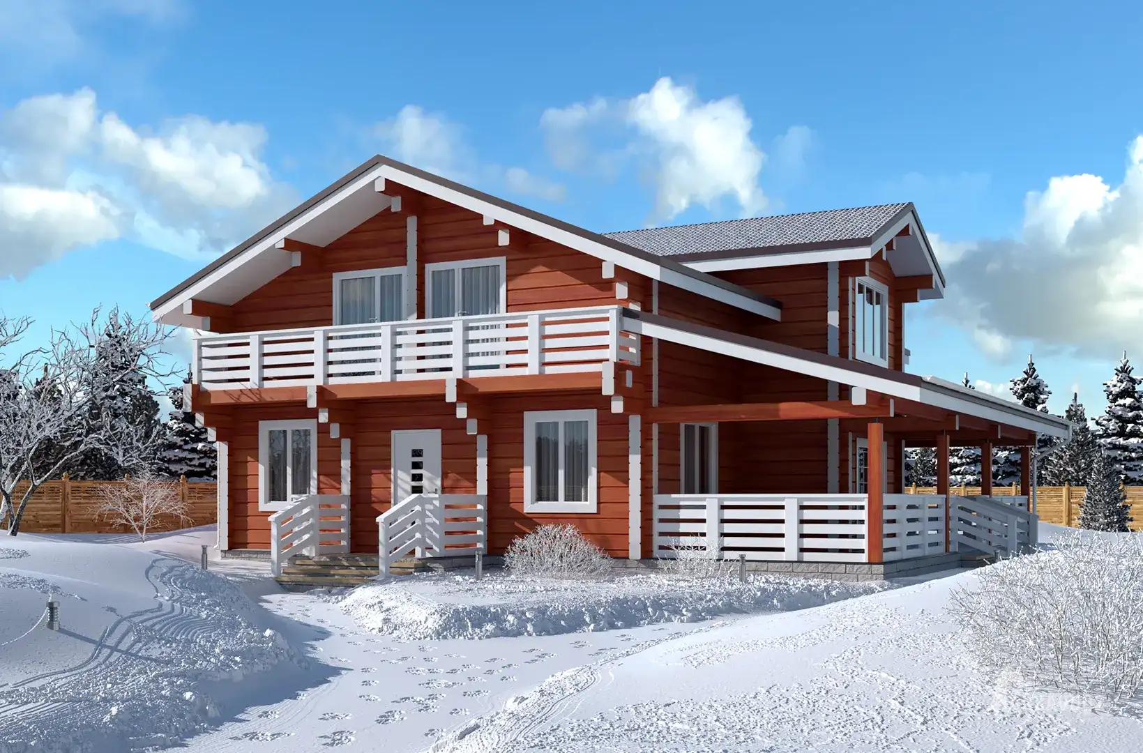 Двухэтажный дом из клееного бруса в скандинавском стиле с 4 комнатами, 2 санузлами, террасой и балконами