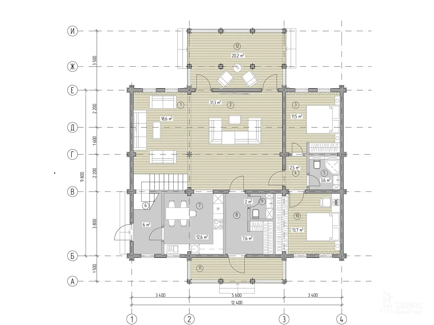 Дом из клееного бруса в стиле русской усадьбы. 4 спальни, 3 санузла. Дополнен террасой и балконами